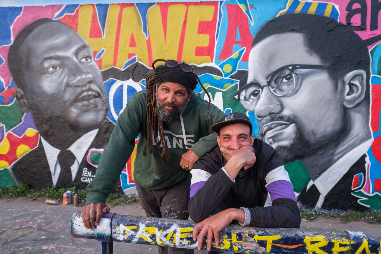 Sonntagnachmittag im Mauerpark, Graffitikünstler Eme Freethinker (links) aus Jamaika (Portraits) und Pen_Chill (rechts) aus Italien (Grafik), 10.06.2020